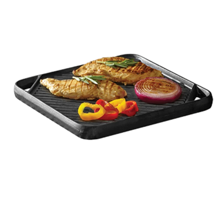 The 08102Y Mr. Bar-B-Q® Griddle has a double-sided function and is designed for the most intensive use. It features a flat and grooved surface and is made of cast iron that provides durability, stability, and even heat distribution. It also has raised edges to catch grease and prevent flare-ups.