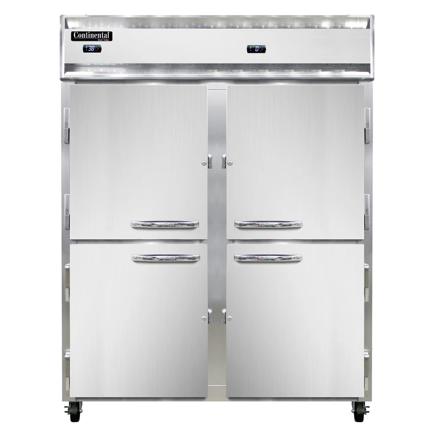 Extra-Wide Refrigerator/Freezer, reach-in, 57″W, two-section, self-contained refrigeration, stainless steel front, aluminum interior & ends, standard depth, (4) half-height solid self-closing doors, cylinder locks, electronic control with digital display, hi-low alarm & hi-low alarm, LED interior lighting, (6) epoxy-coated steel shelves, electric condensate evaporator, dual 1/4 & 1/3 HP, cETLus, NSF, Made in USA