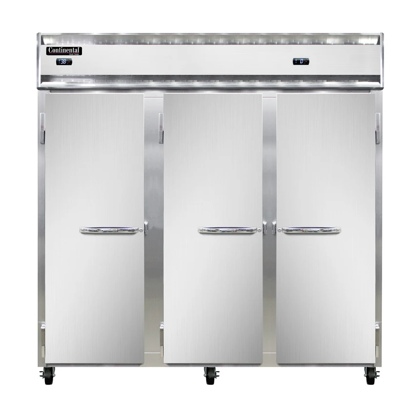 Refrigerator/Freezer, reach-in, three-section, self-contained refrigeration, stainless steel exterior & interior, standard depth, (3) full-height solid self-closing doors, cylinder locks, electronic control with digital display, hi-low alarm & hi-low alarm, LED interior light, (9) epoxy-coated steel shelves, electric condensate evaporator, dual 1/4 & 1/2 HP, cETLus, NSF, Made in USA