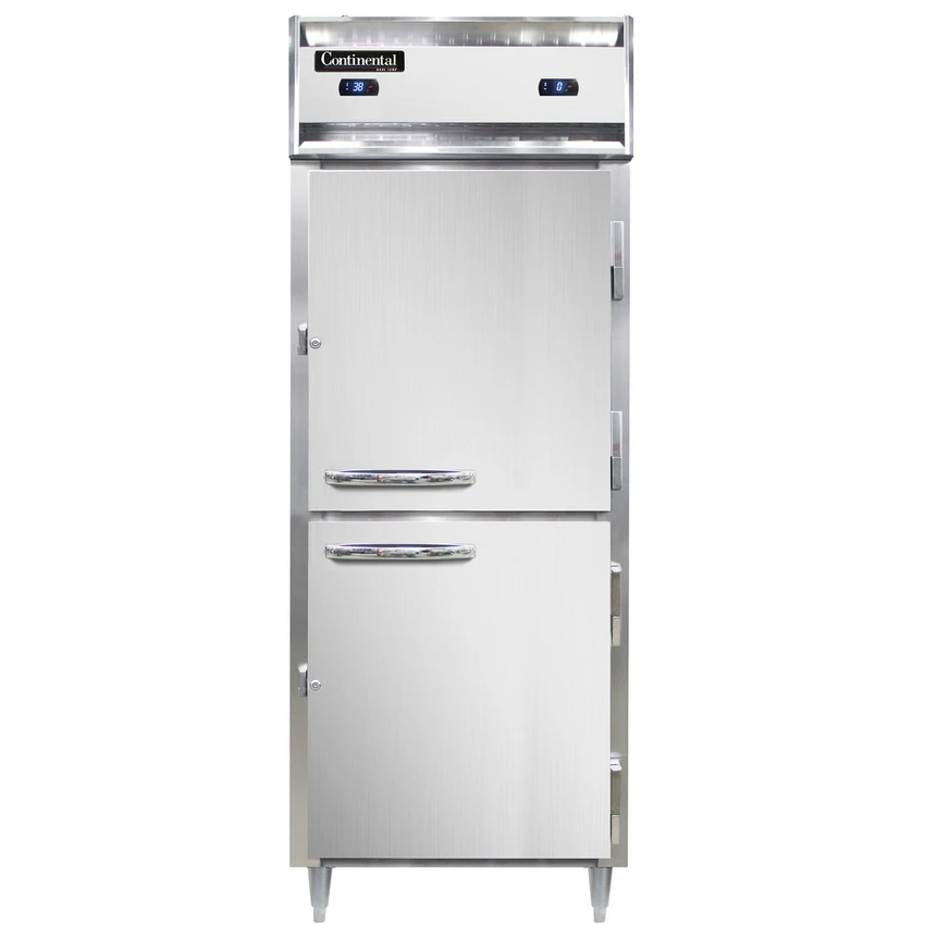 Designer Line Refrigerator/Freezer, reach-in, one-section, self-contained refrigeration, stainless steel exterior, aluminum interior, shallow depth cabinet, wide half-height solid doors, cylinder locks, electronic control with digital display, hi-low alarm, dual 1/5 & 1/4 HP compressors, cETLus, NSF, Made in USA