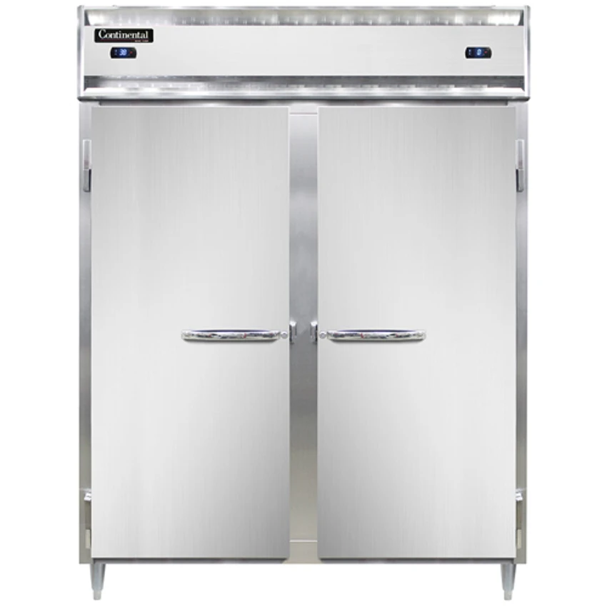 Designer Line Refrigerator/Freezer, reach-in, two-section, 57″W, 22/22 cu. ft., self-contained refrigeration, stainless steel exterior & interior, shallow depth cabinet, wide full-height solid doors, cylinder locks, electronic control with digital display, hi-low alarm, dual 1/4 & 1/3 HP compressors, cETLus, NSF, Made in USA