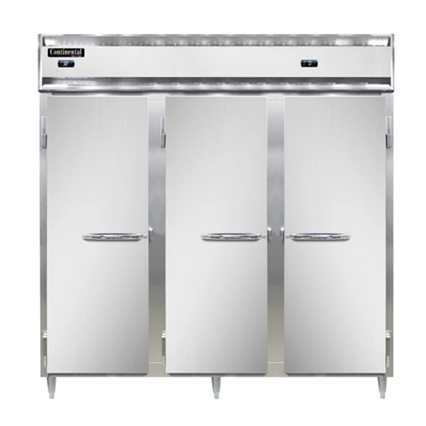 Designer Line Refrigerator/Freezer, reach-in, three-section, self-contained refrigeration, aluminum exterior & interior, stainless steel front & doors, standard depth cabinet, narrow full-height solid doors, cylinder locks, electronic control with digital display, hi-low alarm, dual 1/4 & 1/2 HP compressors, cETLus, NSF, Made in USA
