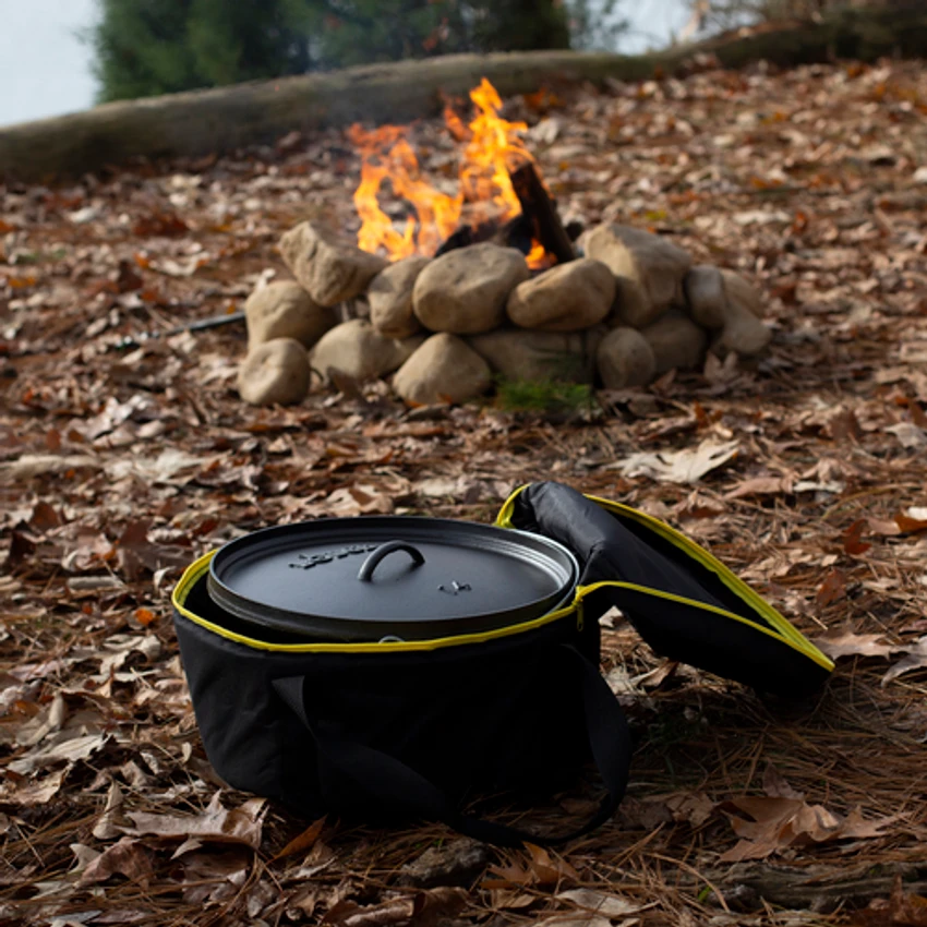 The AT-14 Camp Dutch Oven Tote made by Lodge has padded Velcro® handles and comes complete with carry straps. It features padded side walls, base, and lid and has a convenient self-healing zipper. It is also made of weather-resistant polyester with a PVC back for extra durability and rigidity.