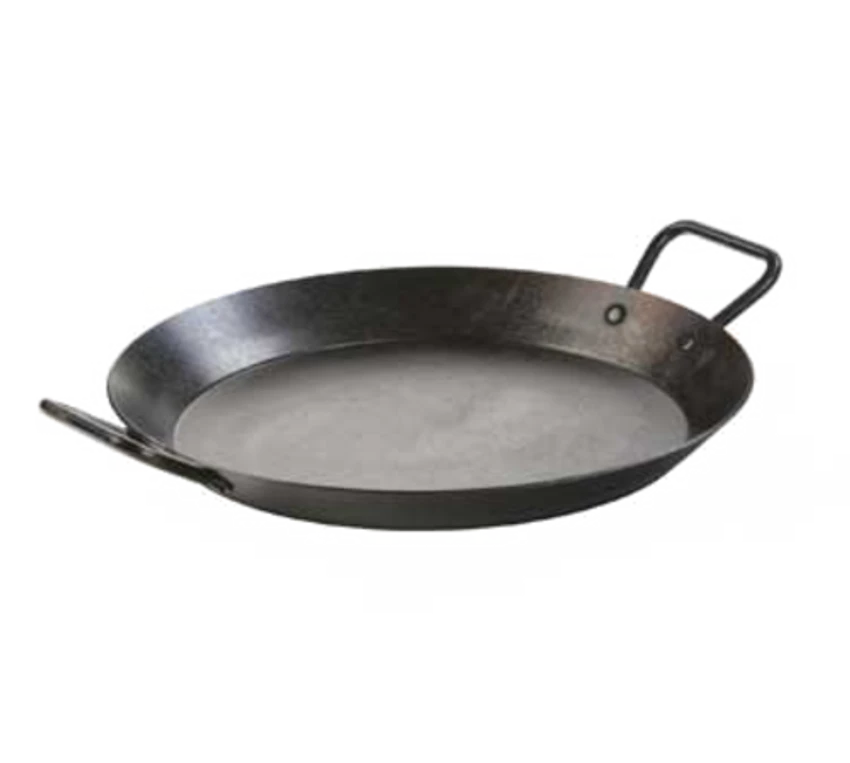 Skillet, 15″ dia. x 2-7/10″H (exterior), riveted dual handles, stove top/induction/grill/campfire/oven safe, seasoned with oil, hand wash only, heavy gauge carbon steel, Made in USA