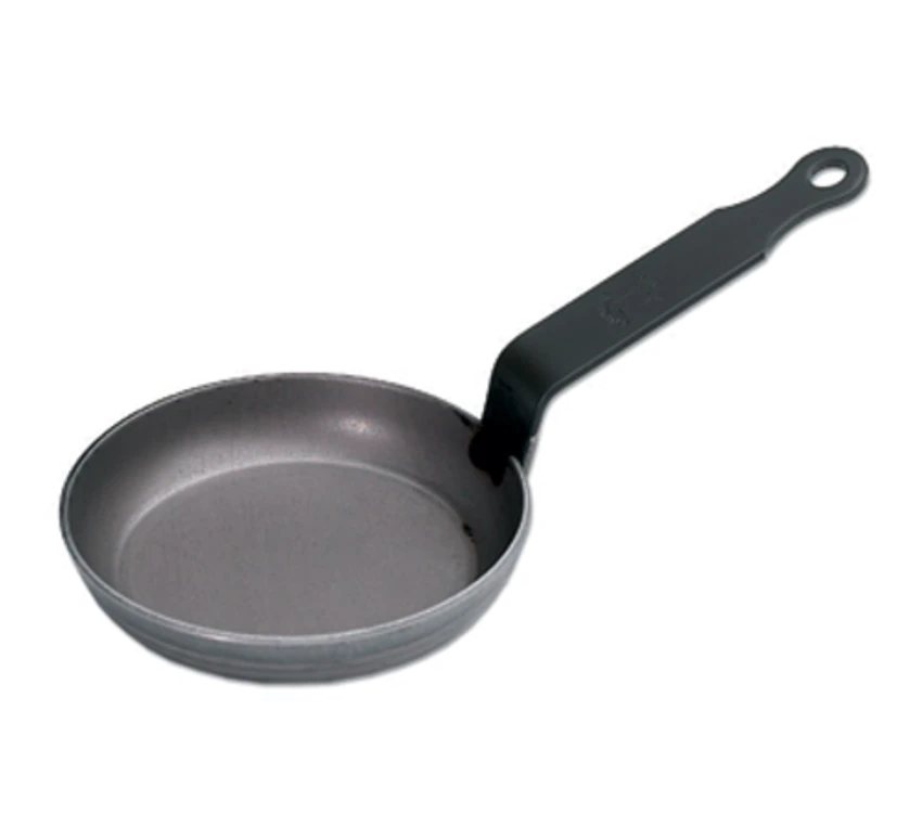Blini Pan, 4-3/4″ dia. x 7/8″H, strong steel strip handle, black steel, suitable for gas, electric, ceramic, halogen, and induction hobs