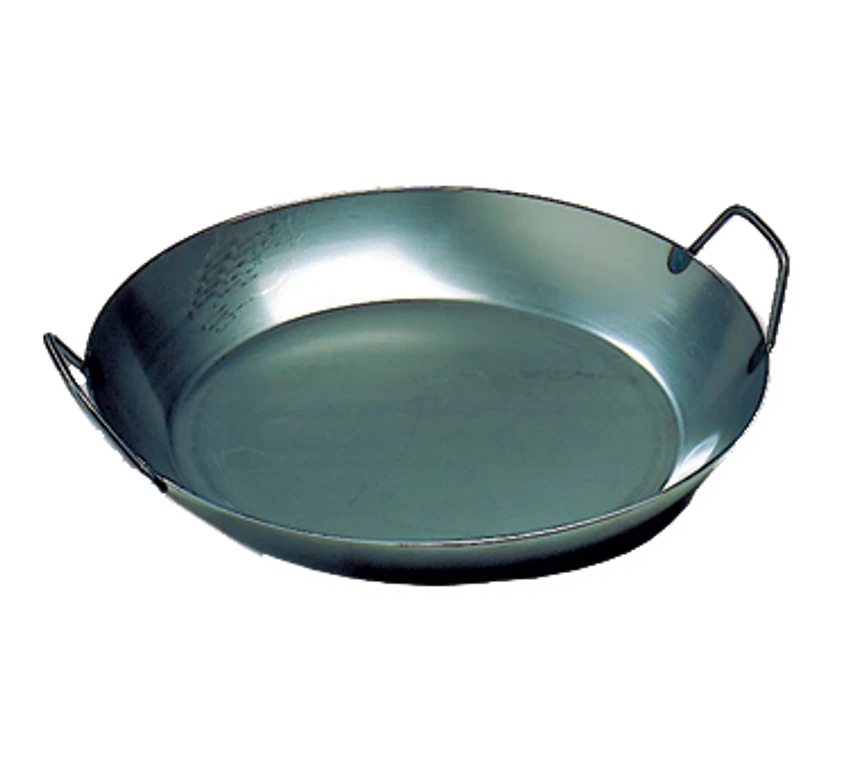 Paella Pan, 14-1/8″ dia. x 1-5/8″H, curved sides, (2) handles, black steel, suitable for gas, electric, ceramic, halogen, and induction hobs