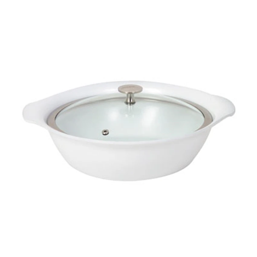 Motif Casserole Pan, 3-3/4 qt., 12″ dia. x 3-1/4″ deep, round, with tempered glass cover, Teflonon-stick and QuanTaniumnterior, coated stainless steel induction base, two-ply exterior, constructed of cast aluminum with ceramic reinforced finish, white