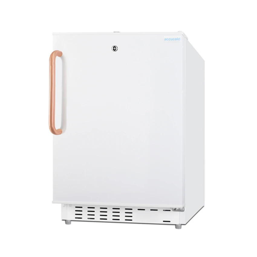 Accucold Undercounter Refrigerator-Freezer, reach-in, one-section, built-in or freestanding, bottom mount self-contained refrigeration, 19.75″W x 25″D x 32″H, 2.68 cu. ft. capacity, (1) reversible solid hinged door (locking), antimicrobial towel bar handle, (3) adjustable glass shelves, (1) crisper, removable door racks, manual defrost, dial thermostat, white exterior, level legs, R600a Hydrocarbon refrigerant, 115v/60/1-ph, 1.1 amps, ETL, cETL, ADA Compliant (Residential)