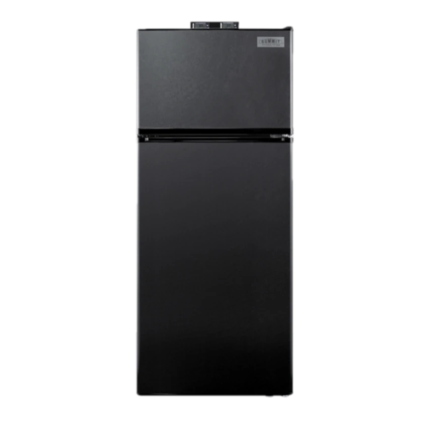 Break Room Refrigerator-Freezer, 23.63″W x 26″D x 59.38″H, 10.3 cu. ft. capacity, frost-free, black finish, reversible doors, top-mounted NIST certified thermometer for each section, high/low temperature alarm, adjustable wire shelves, door storage, crisper, interior light, 115v/60/1-ph, 1.6 amps, UL, ULC (Residential)