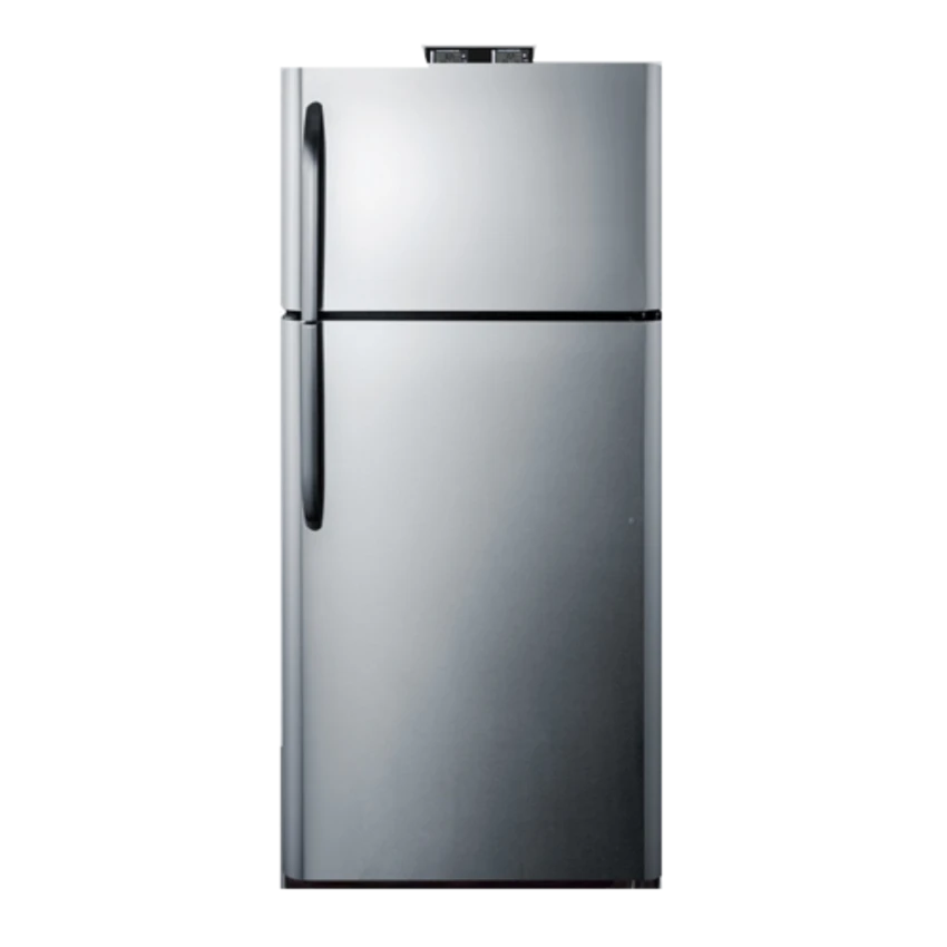 Break Room Refrigerator-Freezer, 29.63″W x 30″D x 67.25″H, 18 cu. ft. capacity, frost-free, black exterior finish, reversible stainless steel doors, sealed back, exterior mounted NIST certified thermometer for each section, high/low temperature alarm, adjustable glass shelves, gallon door storage, crispers, interior light, 115v/60/1-ph, 6.0 amps, CSA (Residential)