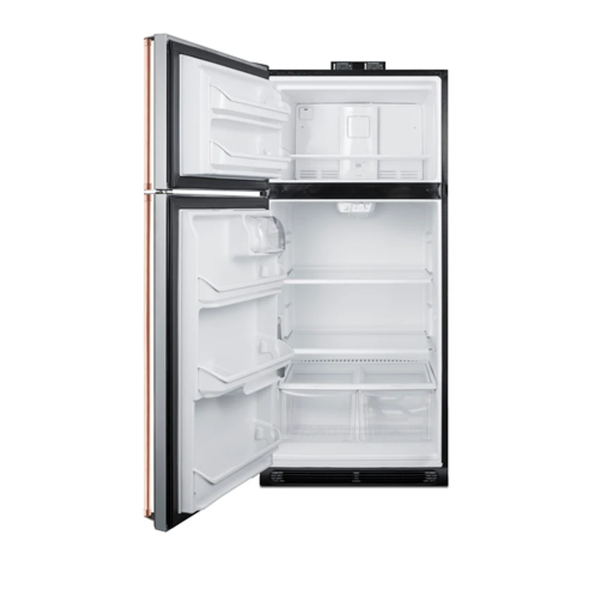 Accucold Break Room Refrigerator-Freezer, 18 cu. ft. capacity, full-length antimicrobial copper pipe style handles, (2) NIST calibrated dial thermostats with digital display, 36° – 46°F refrigerated temperature range, 0° – 10°F freezer temperature range, high/low temperature audible alarms, frost-free operation, interior light, (2) adjustable glass refrigerator shelves, (3) full-door & (1) half-door refrigerator shelves, gallon door storage, (2) transparent crisper drawers with humidity control, (1) wire freezer shelf, (2) full-door freezer shelves, (2) left-hand swing stainless steel doors, textured black cabinet, interior fan, R134a refrigerant, 115v/60/1-ph, 6.0 amps, CSA
