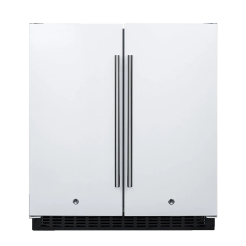 Built-in Undercounter Refrigerator-Freezer, single compressor, 29.5″W x 23.63″D x 34″H, 5.4 cu. ft. capacity, separate refrigerator and freezer compartment, 36° to 43°F refrigerator temperature range, -4° to 4°F freezer temperature range, french door swing, stainless steel handles, white exterior finish, front locks, adjustable shelves, digital thermostat, automatic defrost refrigerator/frost-free refrigerator, Sabbath Mode, LED lighting, open door alarm, high temperature alarm, internal fans, sealed back, right angle plug, 115v/60/1-ph, 1.5 amps, ETL, cETL (Residential)