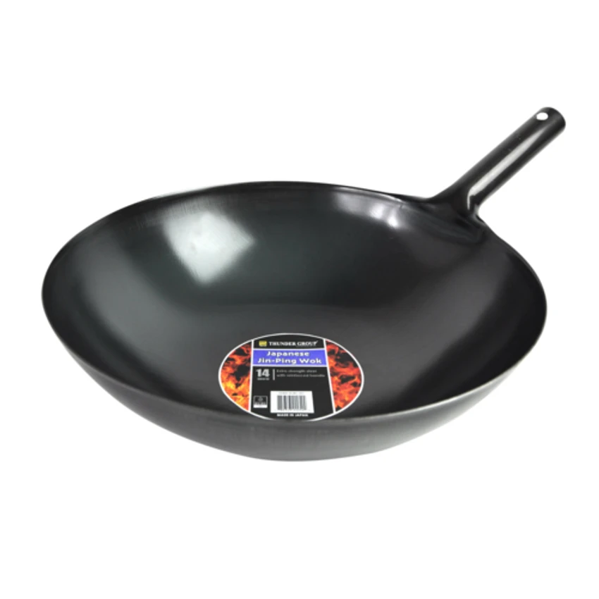 Japanese Jin-Ping Wok, 14″ dia., 4-3/8″ deep, with 5-1/2″ of reinforced sandwiched welding, extra strength steel