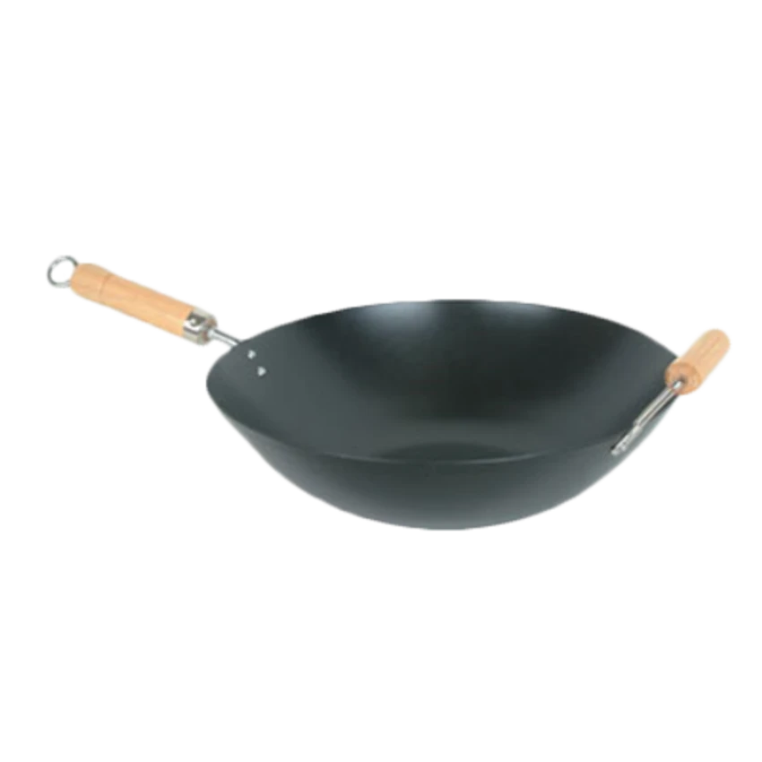 Wok, 14″ dia., non-stick, hanging loop, wooden handle and helper handle, carbon steel