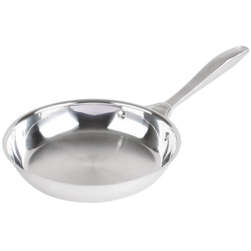 Intrigue® Stainless Steel Fry Pans with Natural Finish, 9-3/8″ (24cm) inside diameter, 1-3/4 inside depth, 18-8 stainless steel body, with 1/4″ thick aluminum & stainless steel clad bottom, ergonomic hollow handle, combination natural/mirror finish, induction ready, NSF, Jacob's Pride® Collection, Limited Lifetime Warranty