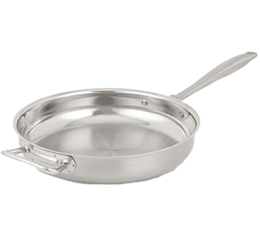Intrigue® Stainless Steel Fry Pans with Natural Finish, 12-1/2″ (32cm) inside diameter, 2-1/2 inside depth, 18-8 stainless steel body, with 1/4″ thick aluminum & stainless steel clad bottom, ergonomic hollow handle, combination natural/mirror finish, induction ready, NSF, Jacob's Pride® Collection, Limited Lifetime Warranty