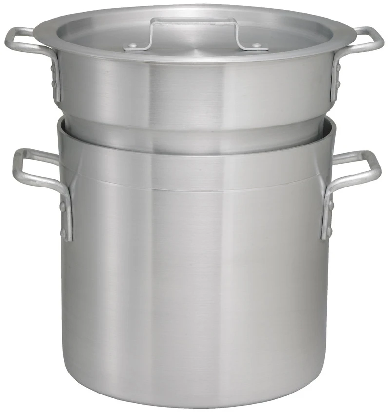 Double Boiler Steamer Set, 8 qt., 10-3/8″L x 8-5/8″W x 7-1/2″H, with stock pot, cover, and steamer basket, reinforced rim, riveted handles, aluminum